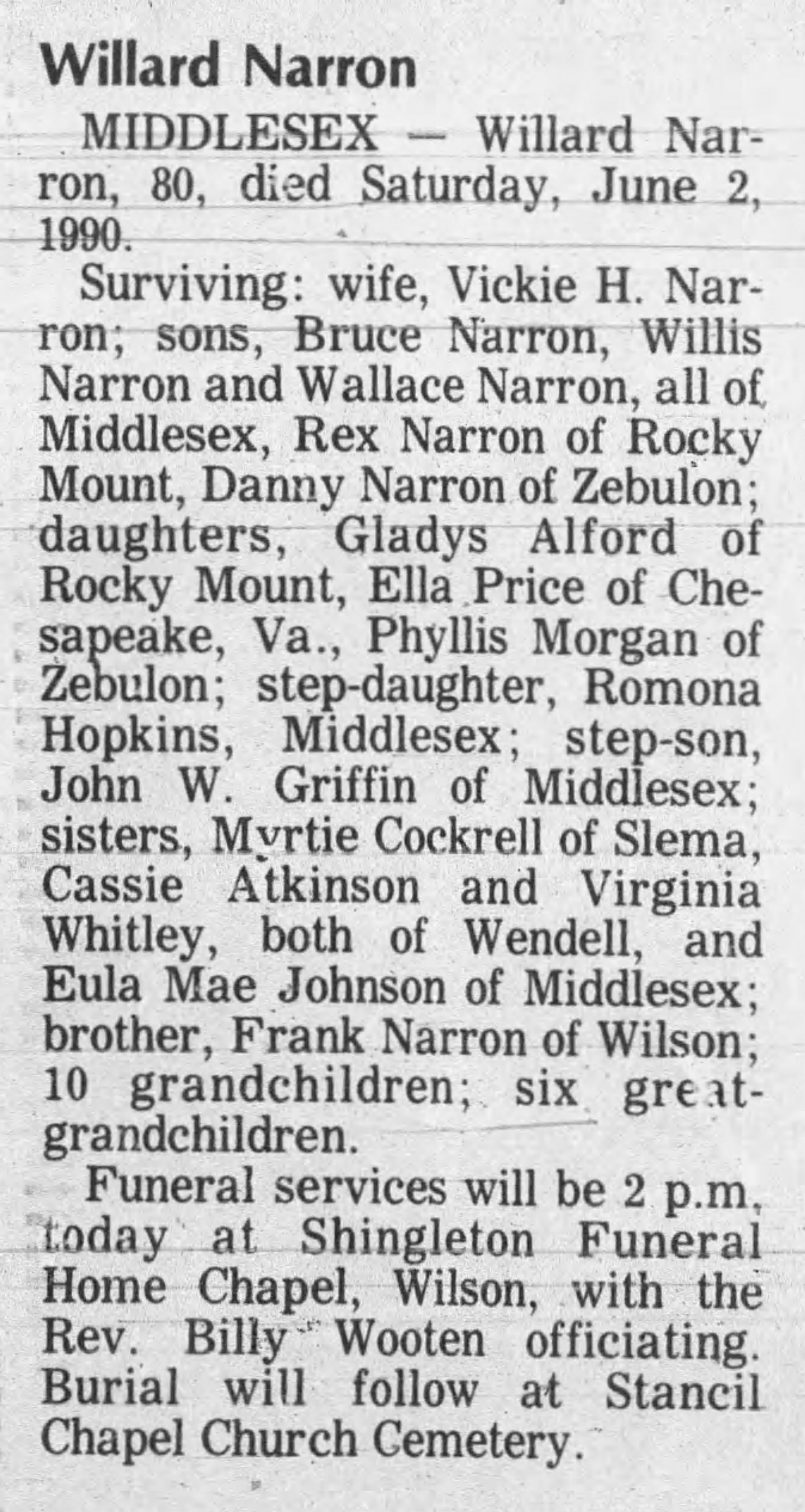 Annie and Willard had seven children: Bruce Narron born on April 14, 1933, Rexall Narron was born on April 22, 1935, Gladys was born on Nov. 19, 1936, Ella was born on Oct. 17, 1938, Wallace was born on July 26, 1940, Evonne was born Sept. 11, 1944, and died the same day. William Willis was born on June 29, 1950. They were all born at home with a midwife assisting.